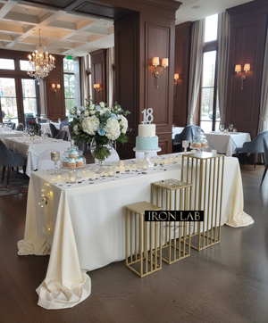 Esalta la scenografia dei tuoi allestimenti con il nostro esclusivo tris di alzate rettangolari in ferro, realizzate interamente a mano. Perfette per matrimoni, diciottesimi e party di tendenza, queste strutture uniscono la robustezza del metallo a una linea minimalista ed elegante.